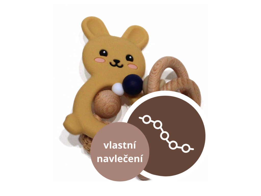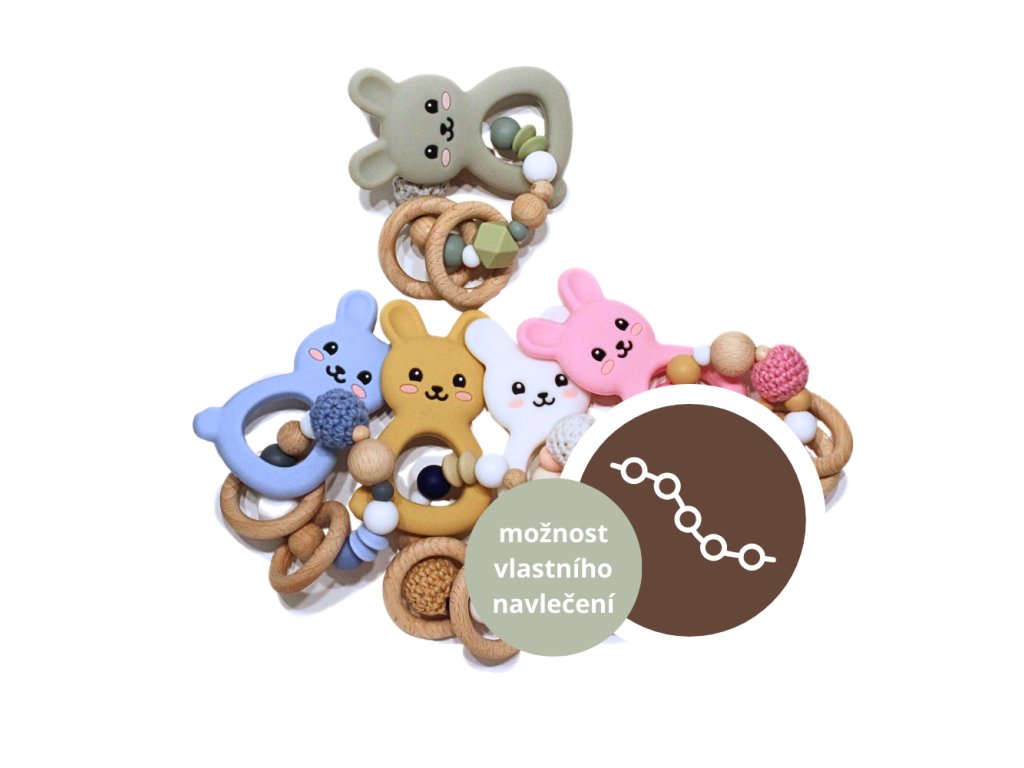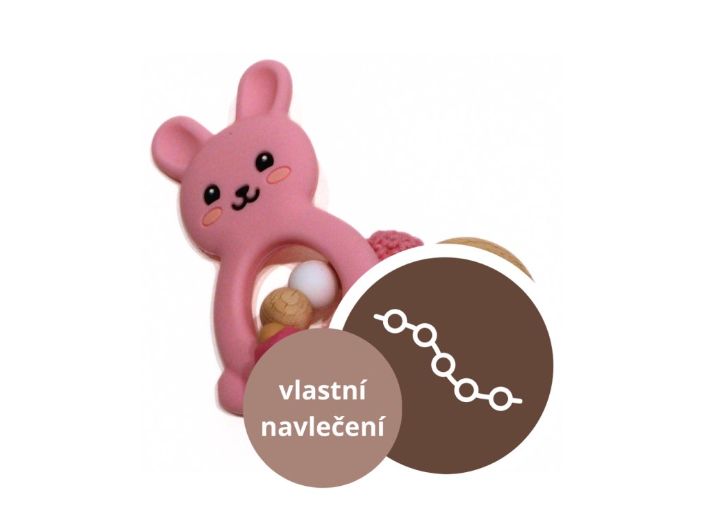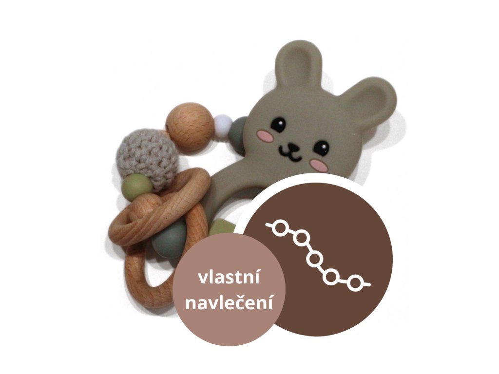 Silikonové kousátko s motivem králíčka z potravinářského silikonu, přírodního bukového dřeva a certifikované bavlny.